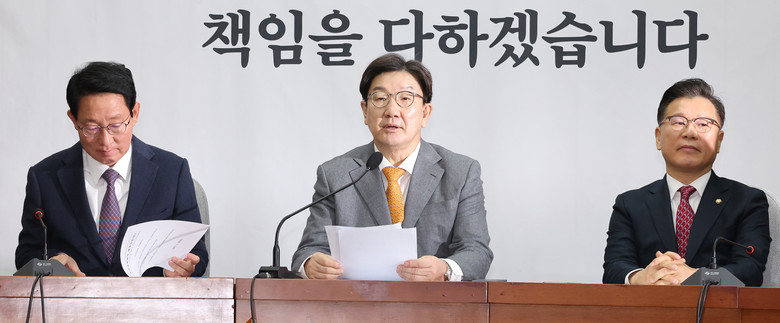 국민의힘 권성동 원내대표(가운데)가 25일 국회에서 열린 원내대책회의에서 발언하고 있다. 2025.2.25