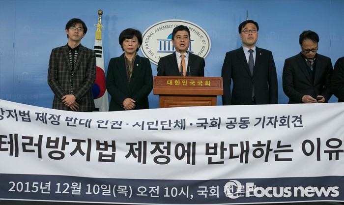| △ 10일 오전 서울 여의도 국회 정론관에서 김기식, 남인순 새정치민주연합 의원과 인권 및 시민단체 관계자들이 테러방지법 제정 반대 기자회견을 하고 있다. <사진제공=포커스뉴스> |