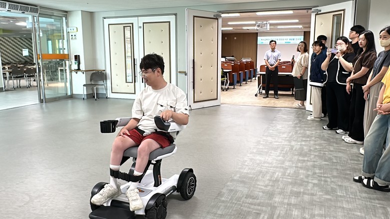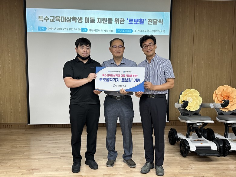 [대전 세계타임즈=이채봉 기자] 대전해든학교(교장 한도영)는 8월 29일(목), 특수교육대상학생의 이동 편의와 안정적인 학교생활을 지원하기 위해 로봇 전동휠체어 전달식을 진행했다. 이번 전달식에서는 ㈜카이로보틱스와 사단법인 토닥토닥의 협력으로 스마트 로봇 전동휠체어 ‘로보휠’을 기부받았다.