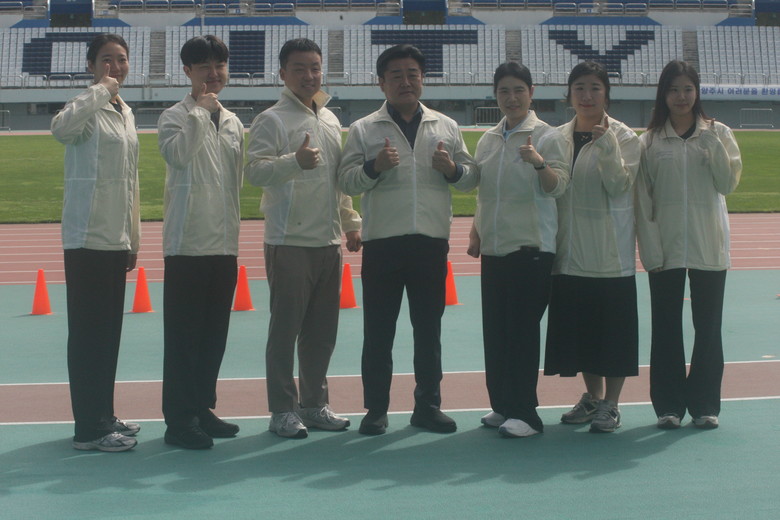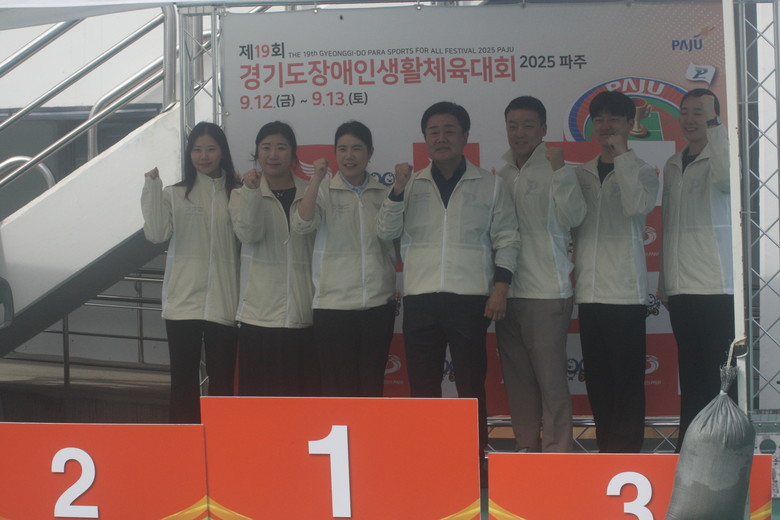 | ▲경기도장애인체육회가 '제19회 경기도장애인생활체육대회' 의 성공적 대회 운영을 위해 마지막날까지 만전을 기하고 있다. 13일 경기도장애인체육회 관계자들이 파주스타디움 주경기장에서 기념촬영을 하고 있다. |