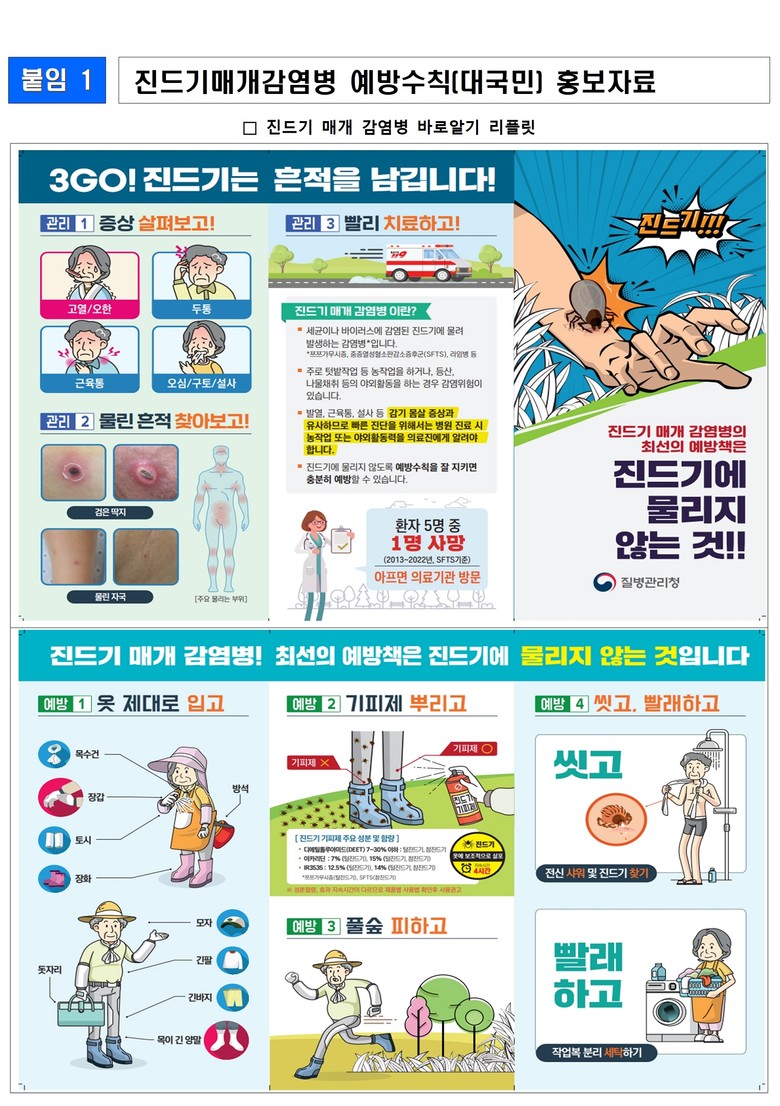 울산시는 감염병 예방을 위해 ▲야외활동 전 노출을 최소화할 수 있는 복장 입기(밝은색 긴 옷, 모자, 목수건, 목이 긴 양말, 장갑 등), 진드기 기피제 사용하기 ▲야외활동 중 풀밭에 앉을 때 돗자리 사용하기, 풀 위에 옷 벗어놓지 않기 ▲야외활동 후에는 귀가 즉시 옷은 털어서 세탁하기 등을 당부했다.