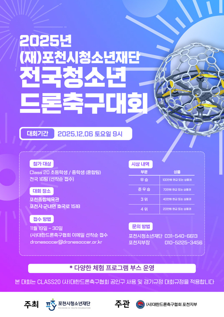 포천시청소년교육문화센터 관계자는 “드론축구는 미래기술과 스포츠가 결합된 새로운 형태의 활동이다. 이번 대회는 전국의 청소년들이 교류하며 성장할 수 있는 값진 기회가 될 것”이라며 “미래기술을 직접 체험하고 싶은 청소년들의 많은 참여를 기대한다”고 말했다.