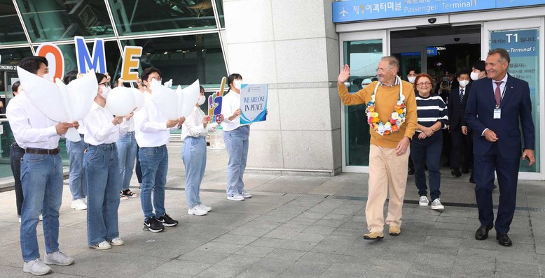 오전 10시 30분 E게이트 입국장에 모습을 나타낸 최고위급 인사는 에밀 콘스탄티네스쿠 전 루마니아 대통령이었다. 그를 환영하기 위해 미리 와있던 HWPL 청년들의 환영 인사에 에밀 콘스탄티네스쿠 전 대통령 내외는 환한 미소로 손을 흔들며 화답했다. 곧이어 의전이 꽃목걸이를 걸어주자 통역과 경호팀은 에밀 콘스탄티네스쿠 전 대통령 내외와 수행원을 의전 차량이 준비된 3층으로 안내했다.
