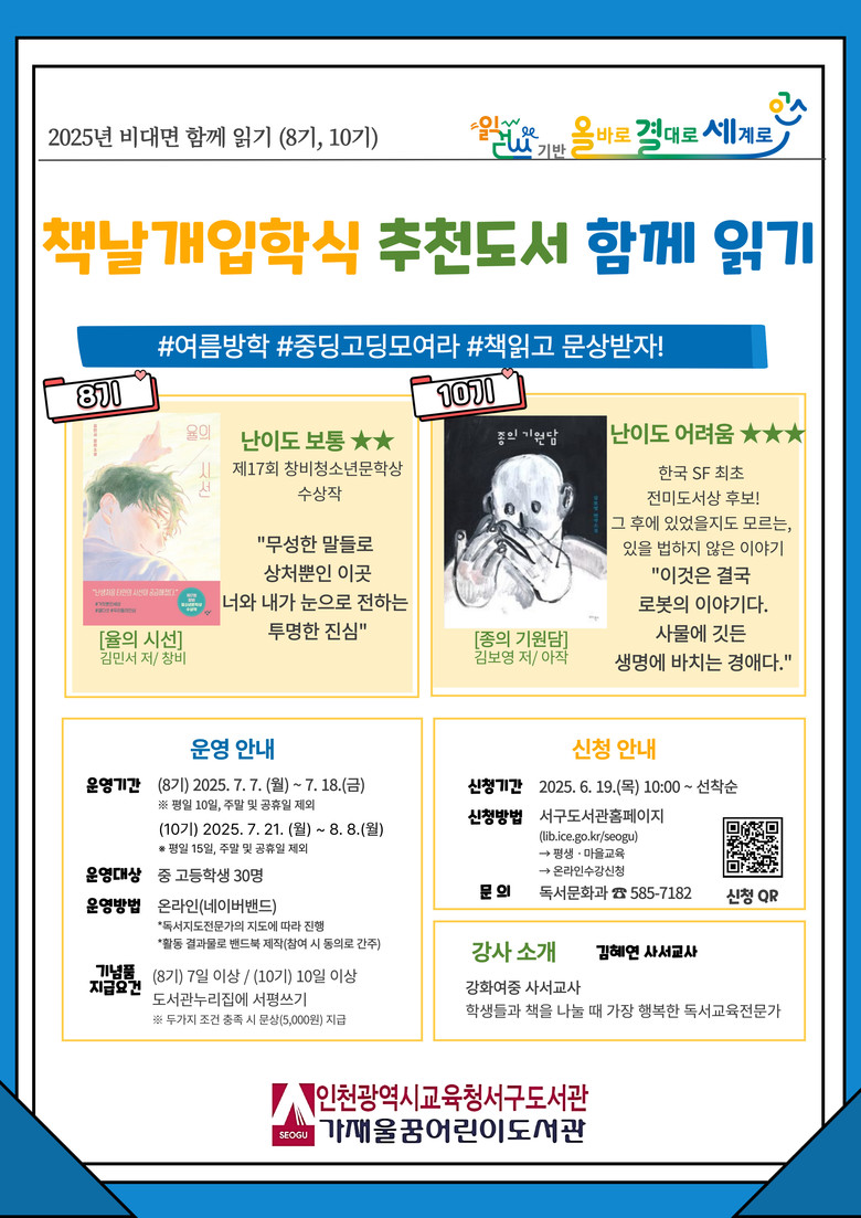 참가 신청은 6월 19일(목) 오전 10시부터 서구도서관 누리집(https://lib.ice.go.kr/seogu)에서 가능하며, 자세한 사항은 서구도서관 누리집을 참고하거나 독서문화과(☎032-585-7182)로 문의하면 된다.