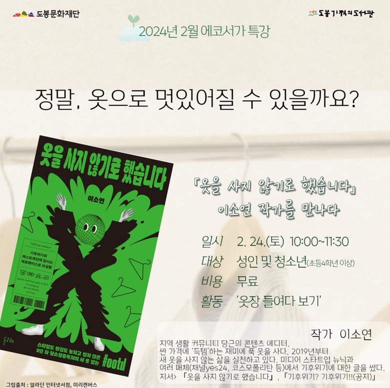 - 2월 24일 첫 번째 시간, 「옷을 사지 않기로 했습니다」 이소연 작가와의 만남 마련