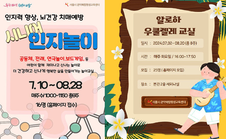 [관악복합평생교육센터=세계타임즈 이상호 기자] 서울시 관악복합평생교육센터(이하, 센터)는 서울시 관악구 낙성대로 70에 위치한 평생학습의 열린배움터로서 서울시민의 공공복리 증진을 위한 다양한 평생교육 프로그램을 운영하고 있다. 7월에 시니어 인지놀이와 성인대상 알로하, 우쿨렐레 음악교실 강의를 개강한다.