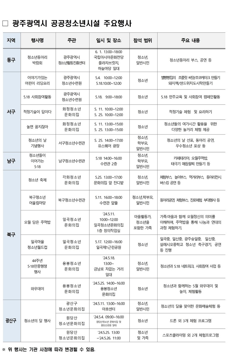 [광주 세계타임즈=손권일 기자] 광주광역시(시장 강기정)는 5월 청소년의 달을 맞아 지역 청소년시설에서 동아리박람회, 적정기술체험, 청소년월드컵 등 다양한 체험 및 기념행사를 연다.