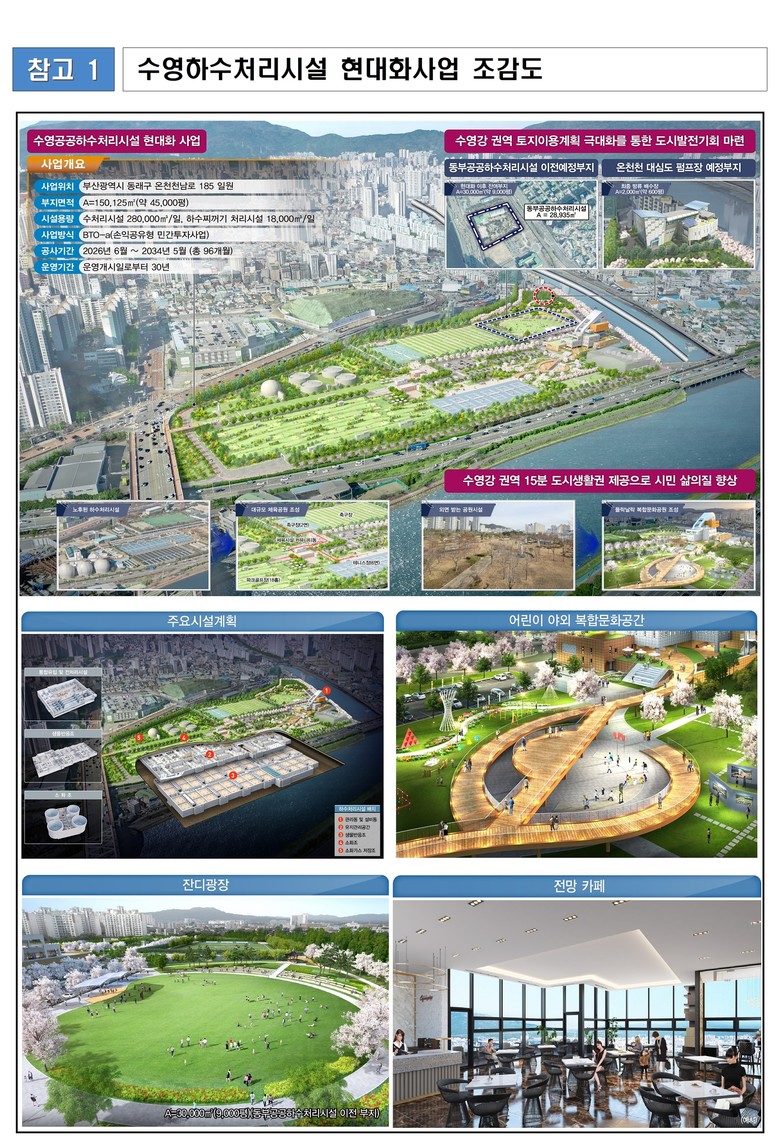 한편, 시는 「수영하수처리시설 현대화사업」을 통해 도심 속 테마공원 조성으로 그간 불편을 겪은 시민 삶의 질 향상과 함께 수영강 권역의 토지이용계획 극대화로 도시발전 기회를 마련할 것으로 기대한다.