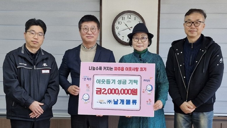 [파주시 세계타임즈=송민수 기자] 파주읍은 지난 4일 ㈜날개물류로부터 이웃 돕기 성금 200만 원을 기탁받았다고 밝혔다. 이번 기탁금은 연말을 맞아 소외계층에게 따뜻한 위로를 전하고자 마련됐다.