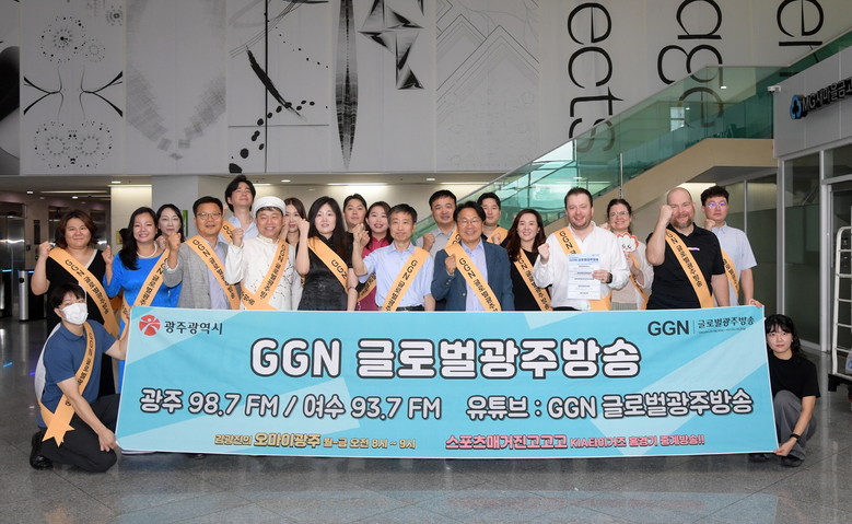 ▲ 강기정 광주광역시장이 26일 오전 시청사 입구에서 출근하는 직원들을 대상으로 광주시 출연기관인 글로벌광주방송 개편 홍보를 한 후 참석자들과 함께 기념촬영을 하고 있다. /광주광역시 제공