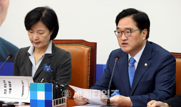 우원식 더불어민주당 원내대표가 6일 오전 서울 영등포구 여의도 국회 더불어민주당 당대표 회의실에서 진행된 최고위원회의에서 모두발언을 하고 있다. 2017.11.06.