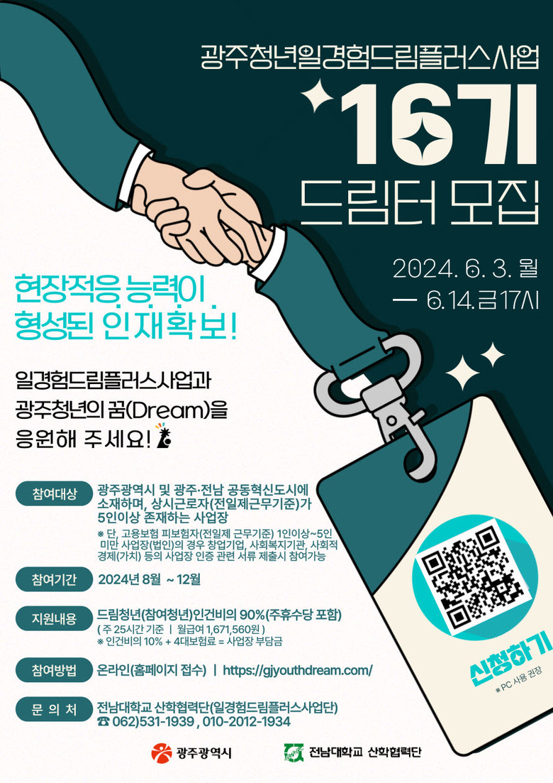 사업에 선정된 16기 ‘드림터’는 8월부터 12월까지 5개월간 광주시로부터 참여청년 인건비 90%를 지원받고, 청년에게 일경험을 제공한다. 이를 통해 지역 내 미취업 청년의 역량 강화를 돕고, 현장 적응 능력을 갖춘 인재영입의 기회를 갖게 된다.