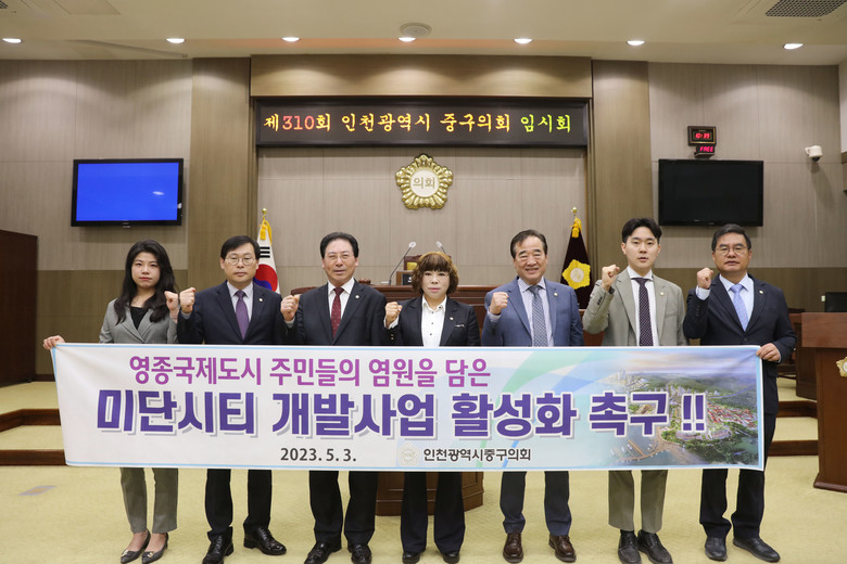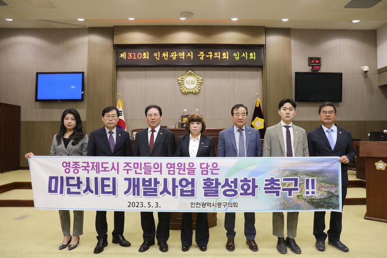 이에 중구의회는 “인천경제자유구역청과 인천도시공사, 그리고 우리 중구청은 긴밀한 협력을 통한 확고한 개발 의지로, 실현 가능한 미단시티의 개발 추진이 필요하며 영종국제도시 주민들의 오랜 염원인 미단시티 개발이 조속히 실현될 수 있도록 촉구한다.”는 입장을 대외적으로 표명했다.