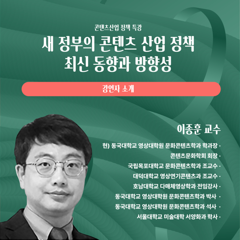 첫 번째 강연자는 동국대학교 이종훈 교수로 △새 정부의 콘텐츠산업 정책 최신 동향과 방향성, △강원 콘텐츠 기업과 창작자에게 미칠 영향 및 기회 등에 대해 강연을 진행한다.
