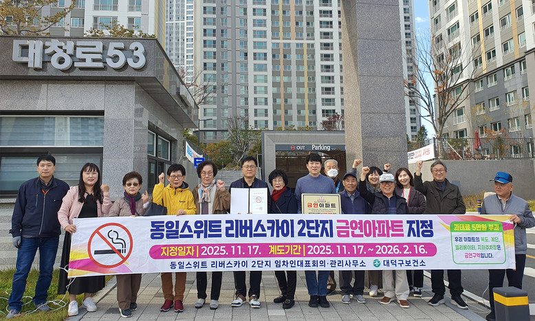 [대덕구 세계타임즈=이채봉 기자] 대전 대덕구(구청장 최충규)는 11월 17일부터 신탄진동 ‘동일스위트 리버스카이 2단지’를 제6호 금연아파트로 지정해 주민 건강 보호를 위한 금연 환경 조성에 나섰다.