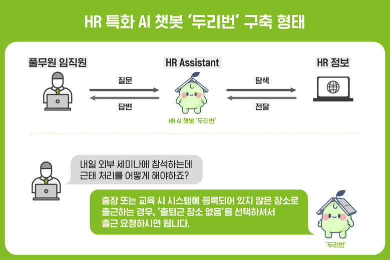 풀무원은 HR 담당자가 처리하는 HR관련 임직원 질의응답, 근태, 복리후생, 각종 조회 및 신청 업무 등 단순, 반복적인 업무를 두리번이 처리해 줌으로써 HR 담당자의 업무 효율성 제고에 도움을 줄 것으로 기대하고 있다. 임직원들은 대기 시간 없이 즉각적인 커뮤니케이션을 통해 24시간 365일 HR 문의에 대한 효율적인 답변을 받을 수 있다.
