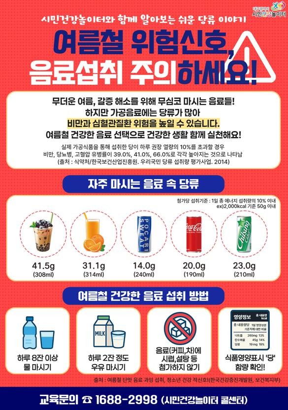 특히, 시민건강놀이터는 무더위 속 당류 과잉 섭취 문제에 대응하고 시민들의 식생활 관리 역량을 강화하고자 7~8월간 여름철 특집 ‘나다운(down)당’ 프로그램을 집중 운영한다.