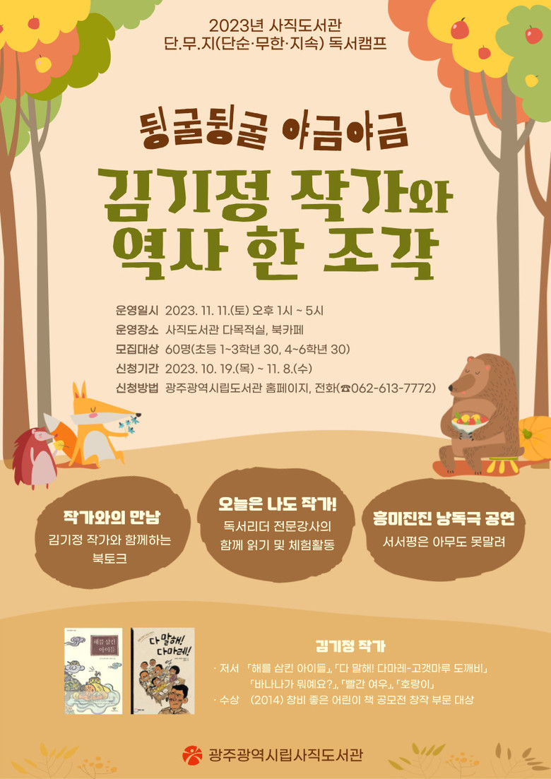 참여 신청은 광주시립도서관 누리집에서 가능하며, 기타 자세한 사항은 사직도서관(062-613-7772)으로 문의하면 된다.