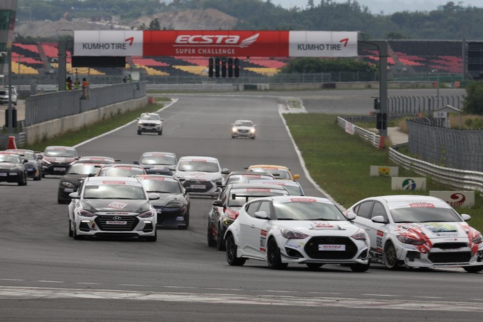[사진설명] 코리아인터내셔널서킷에서 열린 2018 엑스타 슈퍼챌린지 3라운드 슈퍼 200과 슈퍼 TGDI의 혼합 결승전에 참가한 차량들이 힘차게 스타트하고 있다.
