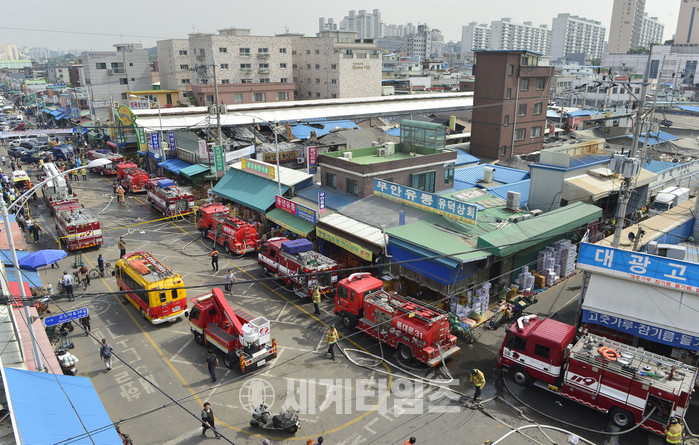 23일 오전 서울 동대문구 경동시장 한 야채가게에서 불이나 현장에 출동한 소방대원들이 화재 진압을 하고 있다. 소방당국은 신고자가 가스통이 있는 쪽에서 불꽃이 튀었다며 정확한 화재원인을 조사중이다. 2017.05.23.