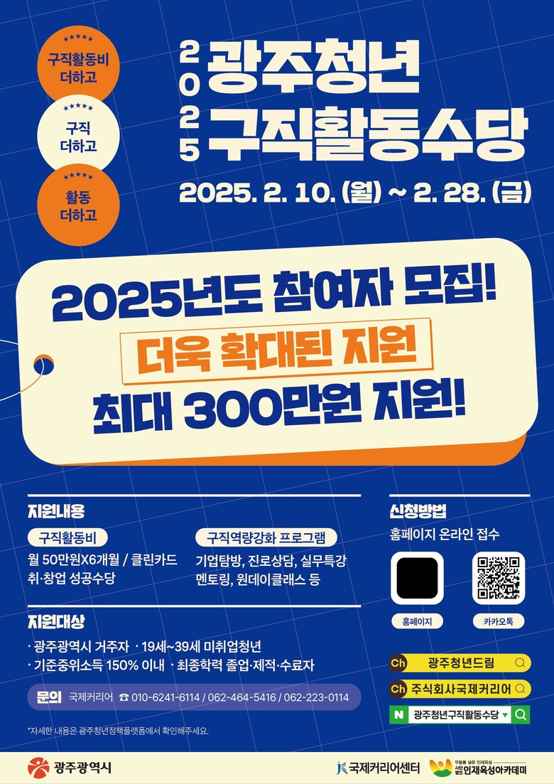 광주광역시(시장 강기정)는 지역 미취업청년을 대상으로 구직활동에 필요한 비용과 다양한 역량강화 프로그램을 지원하는 ‘광주 청년 구직활동수당 지원사업’을 강화해 추진한다.