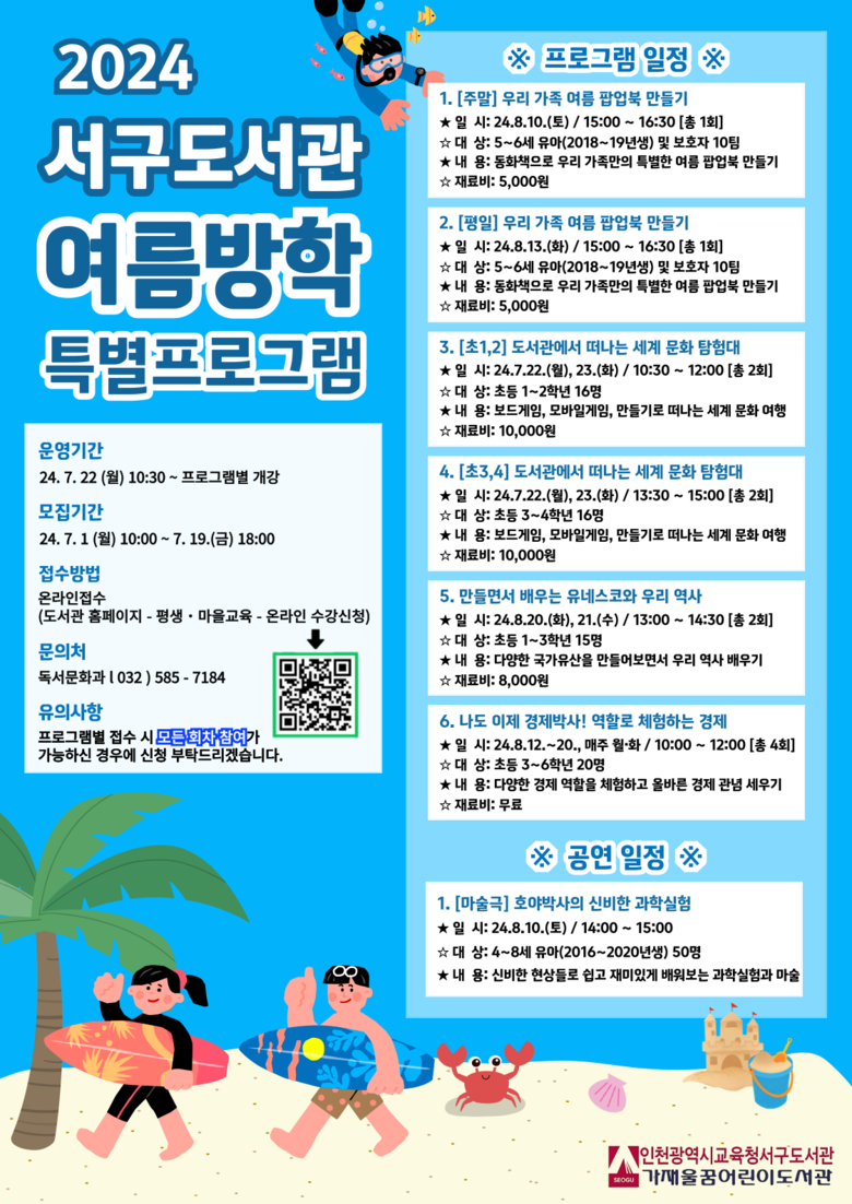프로그램과 공연 신청은 7월 1일 오전 10시부터 선착순으로 접수한다. 운영 프로그램의 세부 내용은 서구도서관 누리집(https://lib.ice.go.kr/seogu)에서 확인할 수 있고, 수강료는 무료(재료비 별도)다. 문의 사항은 독서문화과(☎032-585-7184)로 전화하면 된다.