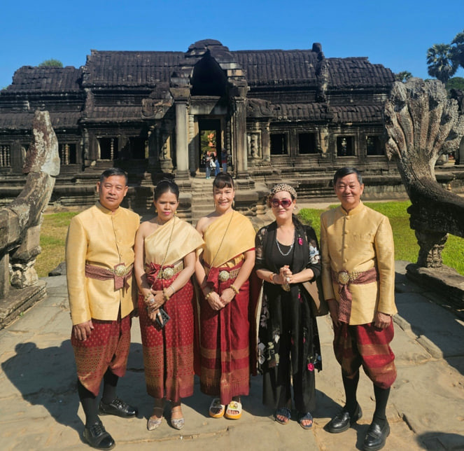 ▲사진 설명| 한-인도 비즈니스문화진흥원 (IKBCC: Indo-Korea Business Culture Center)과 글로벌외교관포럼(Global Diplomats Forum)의 제나 정(Dr. Zena Chung) 이사장이 이날 결혼식을 올린 캄보디아의 젊은 신랑·신부의 양가 부모와 함께 앙코르 와트 사원 야외에서 기념 촬영을 하고 있다.