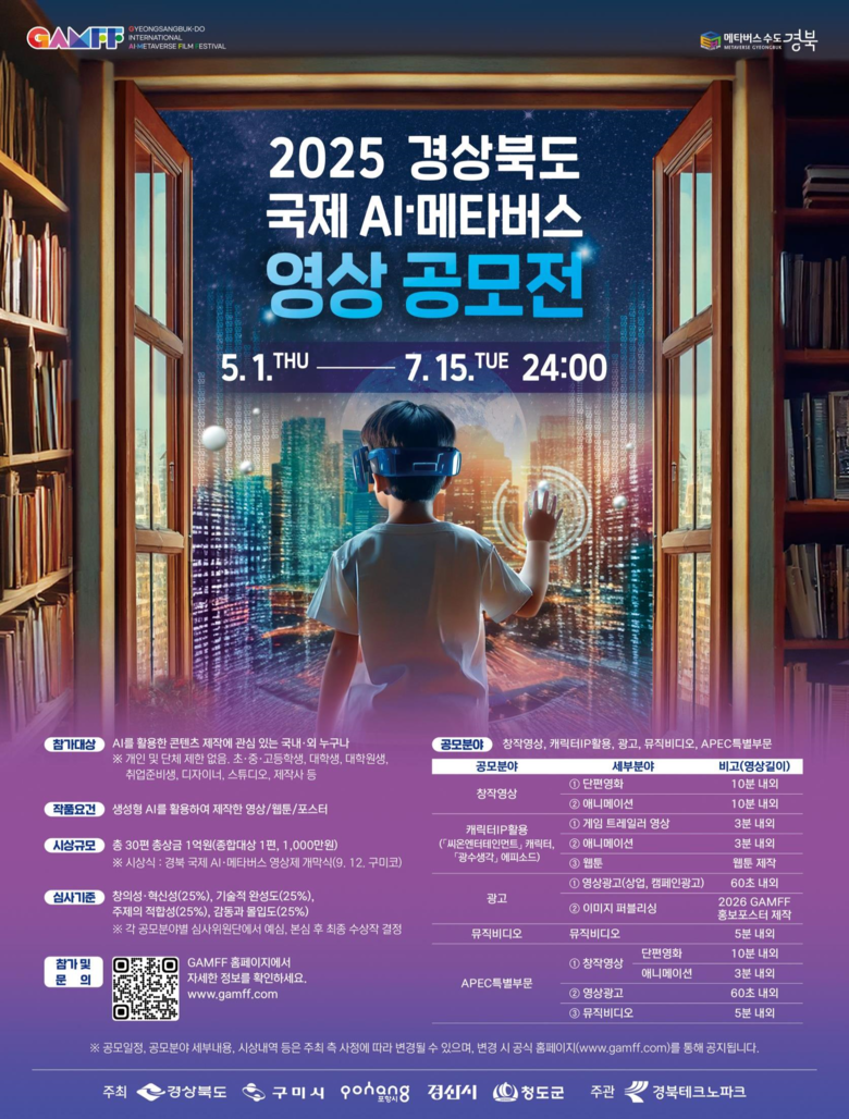 최종 수상작은 9월 12일 구미코(구미)에서 열리는 ‘2025 경북 국제 AI·메타버스 영상제(GAMFF)’ 개막식 시상식을 통해 발표되며, 9월 12일부터 14일까지 구미, 포항, 경산, 청도 일대에서 개최되는 영상제 기간 동안 상영 및 전시될 예정이다.