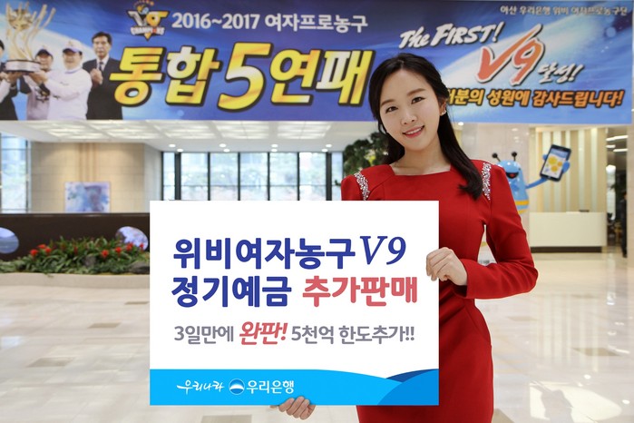 이에 우리은행은 위비여자농구단의 우승을 축하하고 성원해 준 고객에게 감사의 뜻을 전하는 의미로 ‘위비여자농구 V9 정기예금’을 지난 21일부터 판매한 바 있다. 출시 3일만에 당초 판매한도 5천억원이 모두 완판되었으며, 이번에 추가로 한도 5천억원을 증액하여 판매 연장을 결정하였다.