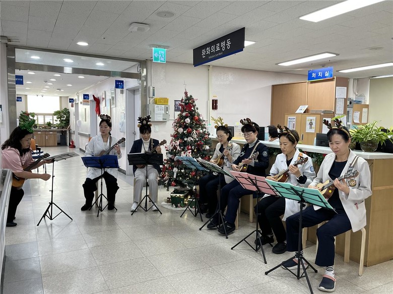 | ▲호스피스병동 음악회_의정부병원 의료진이 환자를 위한 우쿨렐레 연주회를열고 있다.(사진=경기도의료원 의정부병원) |