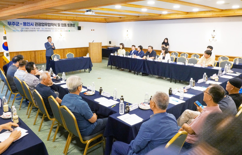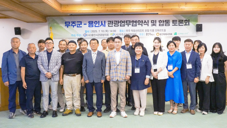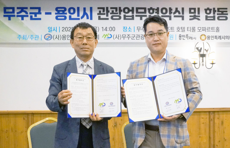 이날 협약식에는 무주군관광협의회(회장 이윤승)와 용인시관광협의회(회장 정윤호) 양측 이사와 용인시의원 등 40여명이 참석했다.