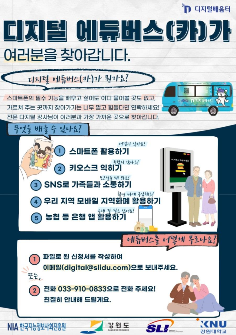 디지털배움터 및 에듀버스 교육 신청은 ☎1800-0096, 033-910-0833으로 문의하면 되고, 디지털배움터 관련 자세한 내용은 디지털배움터 누리집(디지털배움터.kr)를 참고하면 된다.