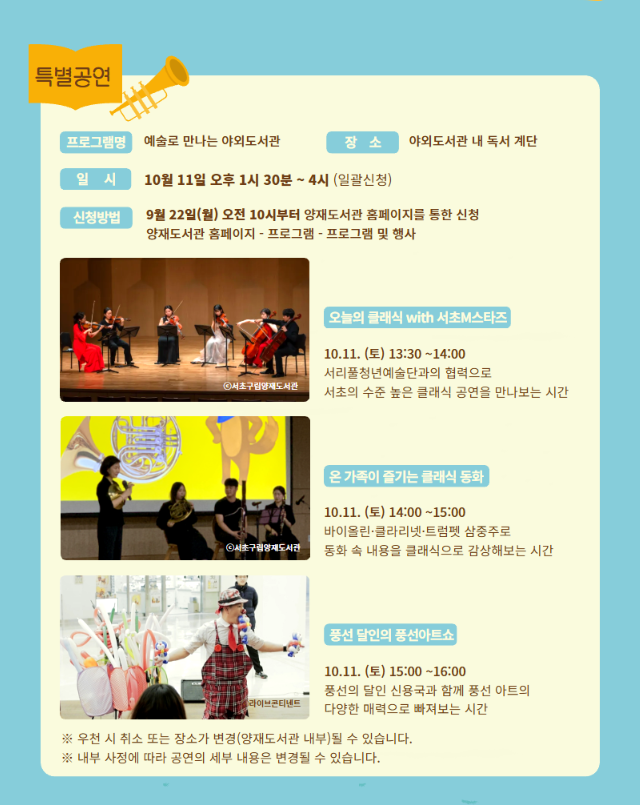특히 첫날인 11일 오후 1시 30분부터 5시까지는 ‘양재천 품은 양재도서관’의 개관을 알리는 행사가 열린다. 서리풀청년예술단 ‘서초M스타즈’의 클래식 공연을 시작으로 해금·바이올린·건반이 어우러진 일미터 클래식 3중주 등 축하공연이 이어질 예정이다. 또 풍선아트 공연과 <책 있는 키즈카페> 손 인형극 체험 등 가족 단위 방문객이 즐길 수 있는 행사도 가득하다. 보다 자세한 내용과 사전신청 방법은 서초구립양재도서관 홈페이지(https://yangjae.seocholib.or.kr)에서 확인할 수 있다.