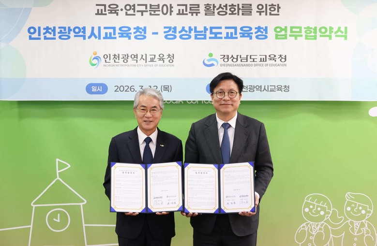 [인천 세계타임즈=심하린 기자] 인천광역시교육청(교육감 도성훈)은 12일, 경상남도교육청(교육감 박종훈)과 읽걷쓰교육 확산과 교육·연구 분야 교류 활성화를 위한 업무협약을 체결했다.