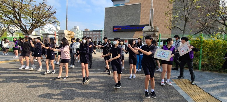 ‘독도교육주간’은 학생자치회의 적극적인 협조로 세 방향으로 이루어졌다. 먼저 등굣길에는 학생자치회 학생들의 캠페인 활동과 함께 ‘독도는 우리 땅’ 노래에 맞춰 학생자치회 학생 전원이 빠짐없이 참여하여 플래시몹을 진행하였다. 처음에는 쑥스러워하던 학생들도 등교하는 친구들과 후배들의 응원에 힘입어 마지막 날에는 교문 밖에서도 멋진 플래시몹을 선보였다. 이러한 활동들은 독도교육주간에 대한 학생들의 관심을 끌기에 충분했고 이후 진행되는 행사에 학생들이 적극적으로 참여하는 계기를 마련해 주었다.