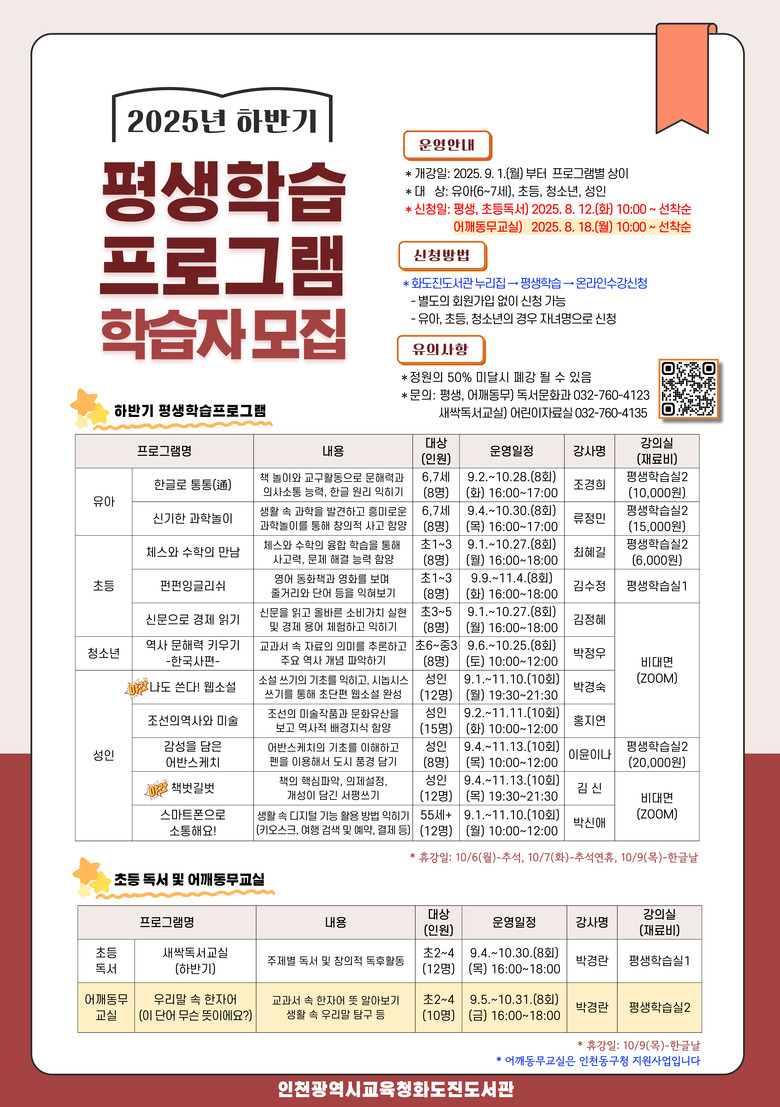 신청은 8월 12일(화) 오전 10시부터 화도진도서관 누리집(https://lib.ice.go.kr/hwadojin)에서 할 수 있으며, 수강료는 무료이다. 단, 일부 프로그램은 재료비가 별도 부담된다.