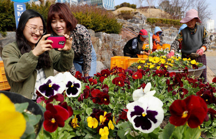 14일 대전 동구청 직원들이 구청 앞 화단에서 팬지, 비올라 등 화사하게 핀 봄꽃들을 카메라에 담으며 즐거운 시간을 보내고 있다.
