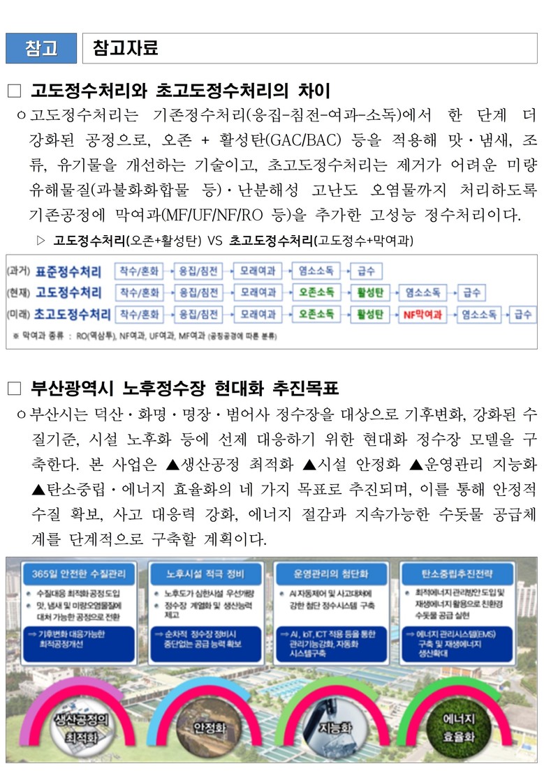 [부산 세계타임즈=이용우 기자] 부산시 상수도사업본부(이하 본부)는 시민에게 더욱 안전하고 깨끗한 수돗물을 안정적으로 공급하고 부산의 물관리 체계를 미래형으로 전환하기 위해 노후정수장 4곳을 대상으로 '초고도정수처리공정'을 도입하는 현대화 사업을 추진한다고 밝혔다.