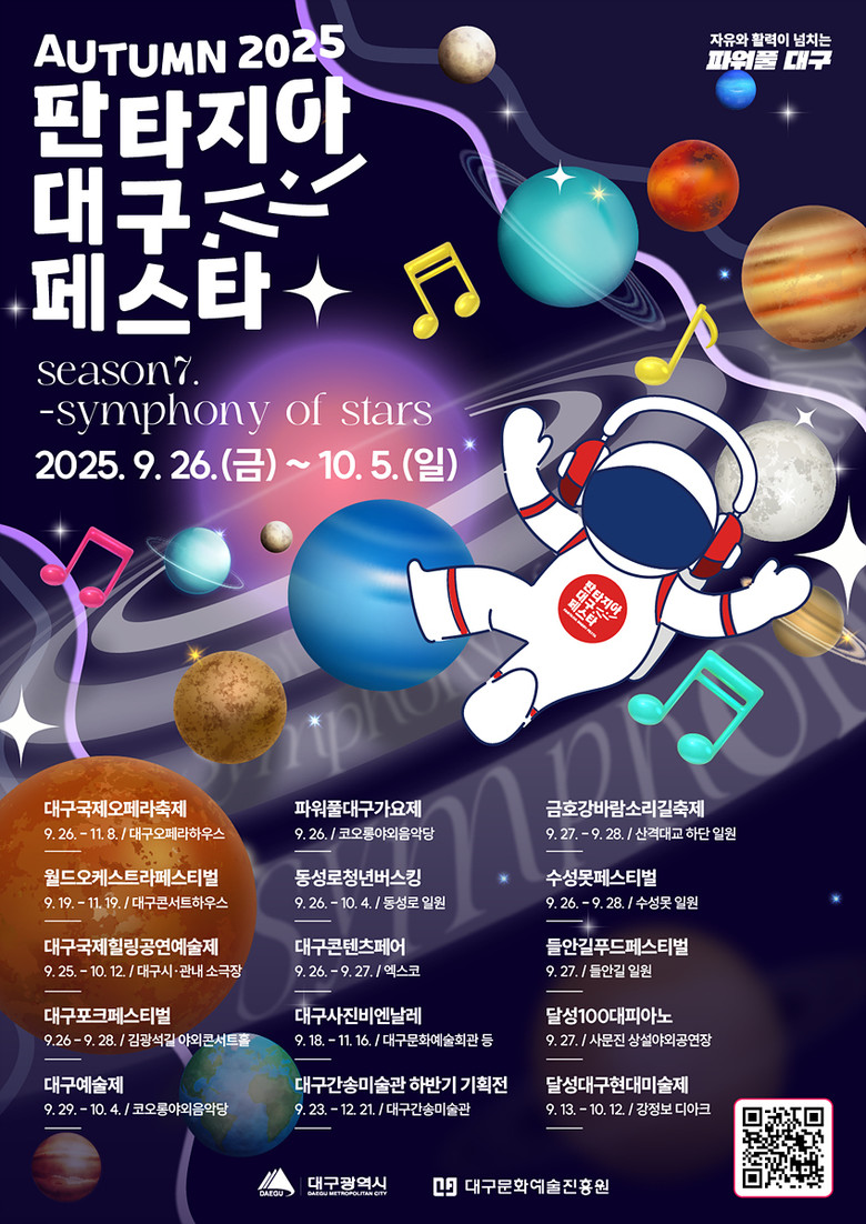 주요 공연으로는 토요시민콘서트(신천 수변무대), 판타지아대구페스타 가을축제인 ‘2025 대구예술제’(코오롱 야외음악당)와 청년버스킹(동성로 일원) 등 다양한 볼거리가 시민들이 즐겨 찾는 야외 도심 무대에서 열린다.