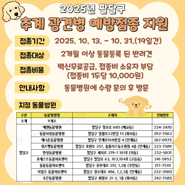 관내 지정병원 9개소를 통해 실시하는 '2025년 추계 광견병 백신 무료 지원'은 동물등록을 마친 2개월 이상 된 개가 대상이며 반려견 보호자는 접종비 1만 원만 부담하면 된다. 다만, 동물등록이 완료돼 있어야 무료로 접종할 수 있고 미등록 개의 경우 당일 동물등록 후 접종할 수 있다.