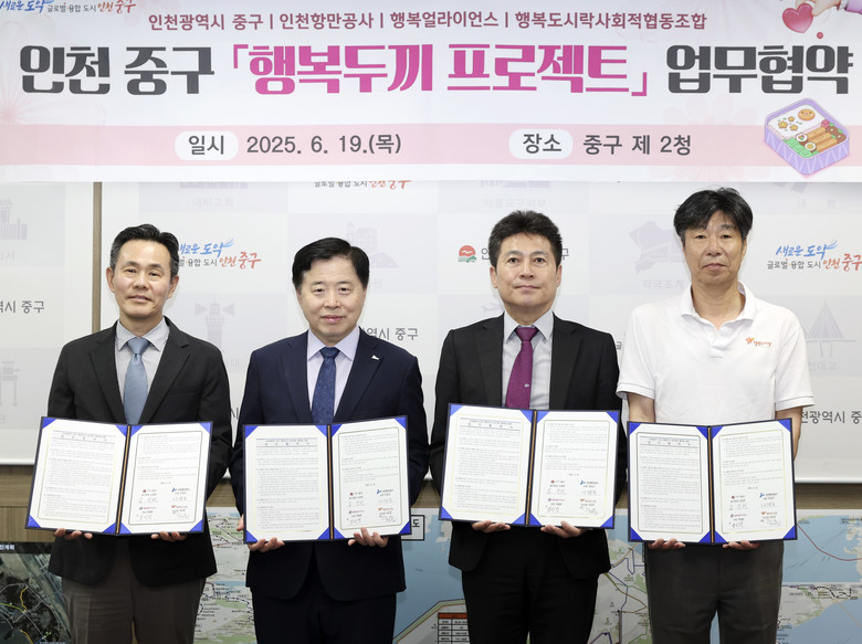 한편, 협약식은 지난 19일 오후 중구 제2청 구청장실에서 김정헌 구청장, 인천항만공사 이경규 사장, 행복나래㈜ 조민영 본부장, 행복도시락 사회적협동조합 최준 사무국장이 참여한 가운데 열렸다.