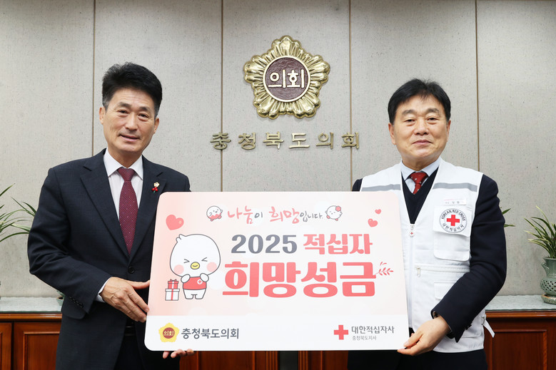 [충북 세계타임즈=송민수 기자] 충북도의회는 8일 도의회 의장실에서 이양섭 의장과 장현봉 대한적십자사 충북지사 회장이 참석한 가운데 2025년 적십자 특별회비 전달식을 가졌다.