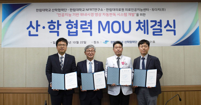 한림대학교의료원 의료인공지능센터, 한림대학교 뉴프론티어리서치연구소(NFRT, New Frontier Research Team), 한림대학교 산학협력단, 두다지(주)는 10월 22일 한림대학교에서 ‘인공지능 기반 위내시경 영상 자동판독 시스템’ 개발과 실용화를 위한 4자 업무협약을 체결했다.