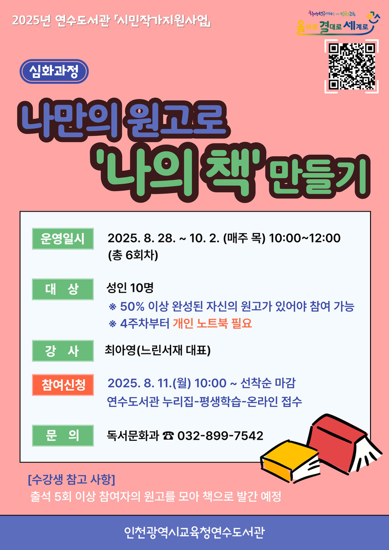 참여 신청은 8월 11일(월) 오전 10시부터 연수도서관 누리집(https://lib.ice.go.kr/yeonsu) ‘평생학습-온라인접수’ 메뉴에서 가능하다.