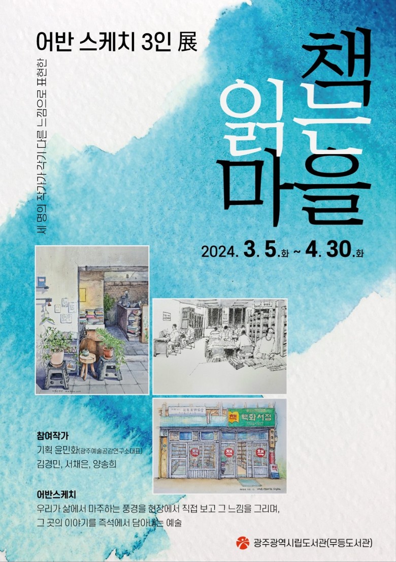 이번 전시는 광주어반스케쳐스 운영위원으로 활동하고 있는 김경민, 서채은, 양송희 등 어반스케치 작가 3명이 ‘책과 도서관’을 주제로 한 작품을 선보인다.