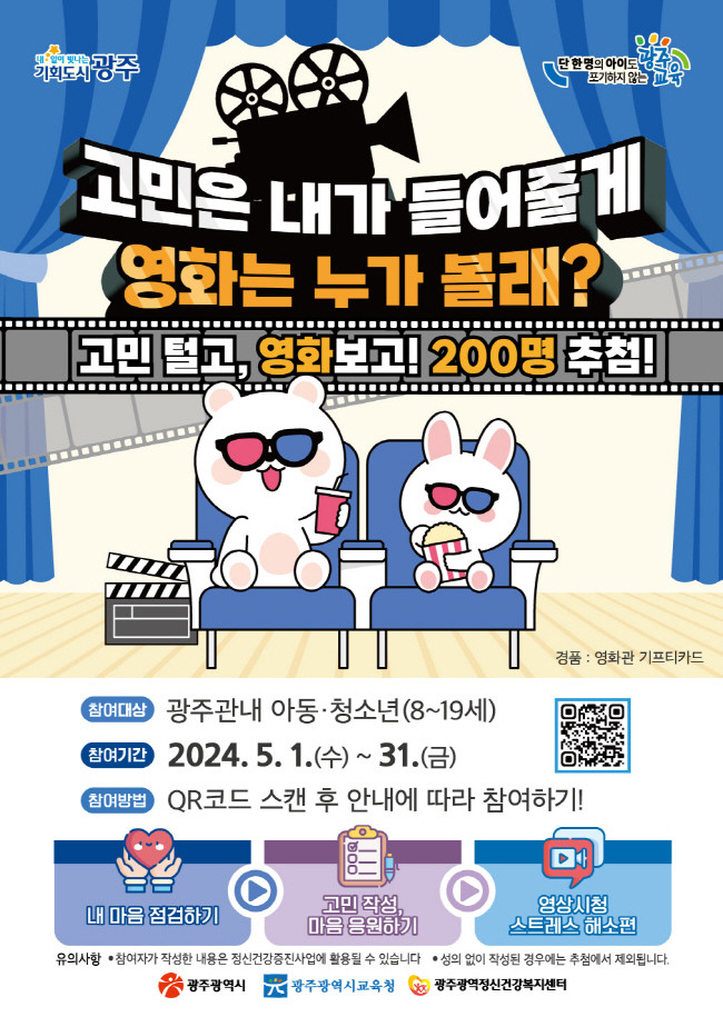 - 참여자 경품 지급…청소년 10명중 3명 “정신건강 어려움 겪어” [광주 세계타임즈=손권일 기자] 광주광역시(시장 강기정)는 아동과 청소년의 정신건강 인식개선을 위해 5월 한 달간 ‘고민은 내가 들어 줄게~ 영화는 누가 볼래?’를 주제로 온라인 캠페인을 벌인다.