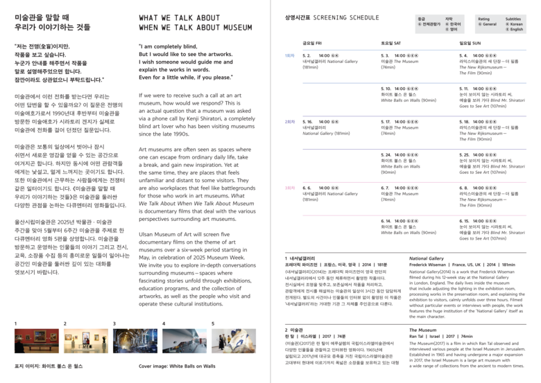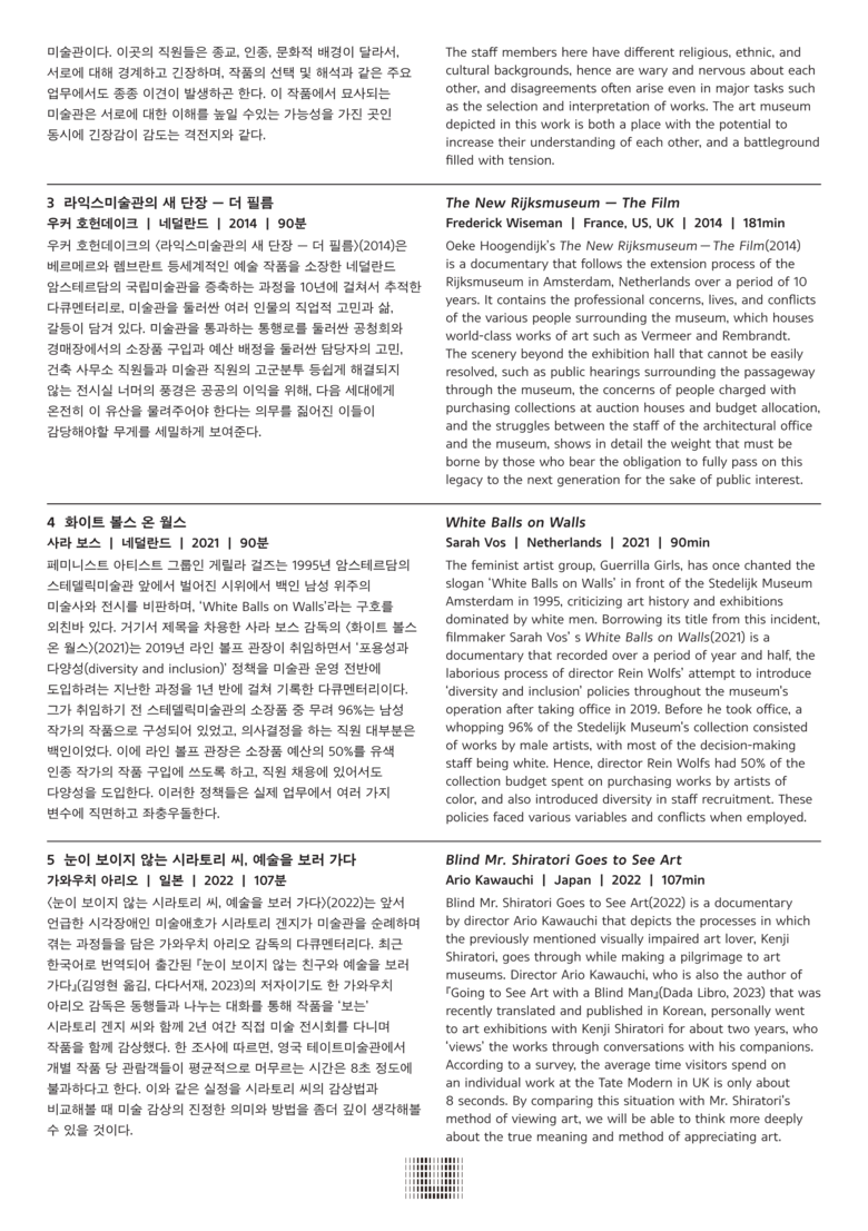 다양한 관점으로 미술관을 바라보는 이 상영작들은 미술관을 방문하거나 운영하는 사람들의 이야기, 전시, 교육, 소장품 수집 등 흥미롭고 다채로운 일들이 일어나는 미술관에 대한 깊이 있는 이해와 정보를 제공한다.