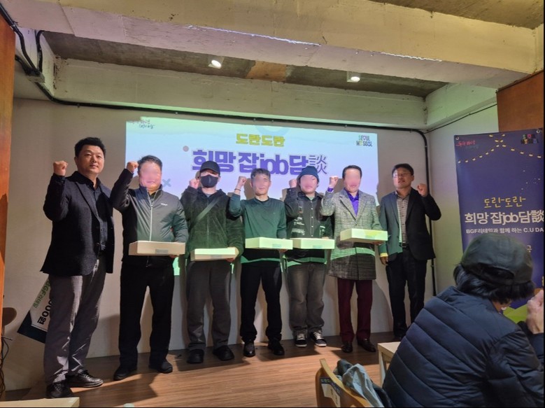 행사에는 공공기관, 광고회사 등 민간기업 취업자(18명)와 구직자(8명), 시설 일자리 담당자, 후원사인 BGF리테일 관계자 등 50여 명이 참석했다.
