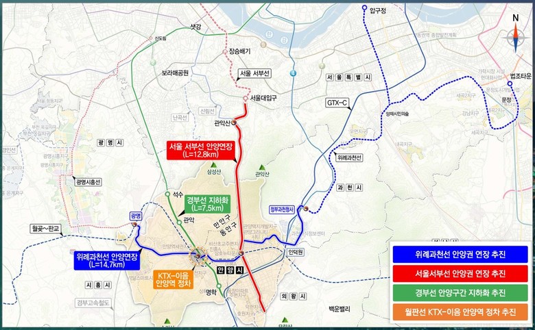 안양시는 관내 주요 개발사업에 시너지를 더하고 만안구와 동안구의 동반성장을 촉진하는 안양권 철도망 구축계획안으로 ▲위례과천선·서울서부선 안양권 연장 ▲경부선 안양구간 지하화 ▲KTX-이음 안양역 추가 정차 등을 추진하고 있다.