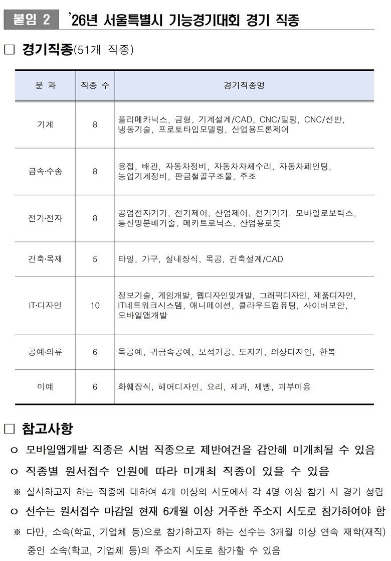 금형, 주조 등 서울시 제조업 경쟁력을 뒷받침해 온 뿌리기술 직종과 더불어 산업용드론제어, 메카트로닉스 등 미래산업 핵심 직종을 함께 구성해 총 7개 분과 51개 직종에서 참가 신청을 받는다.